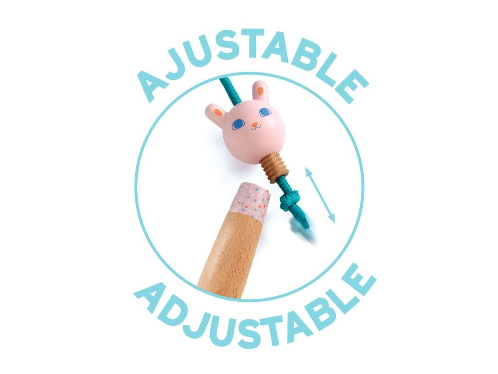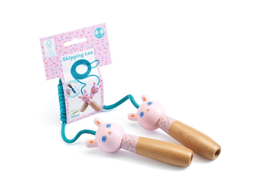 Švihadlo Djeco Lea je krásně zpracovaná hračka pro děti, které milují pohyb. Jeho barevné provedení a dřevěné držadla s ilustracemi zaujmou na první pohled. Délku švihadla lze přizpůsobit, takže je vhodné pro děti různého věku.