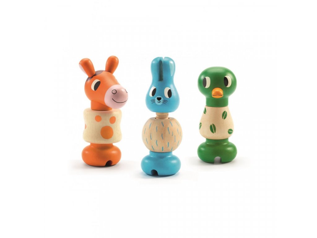Djeco dřevěné šroubování Tři zvířátka pro děti od 18 měsíců.