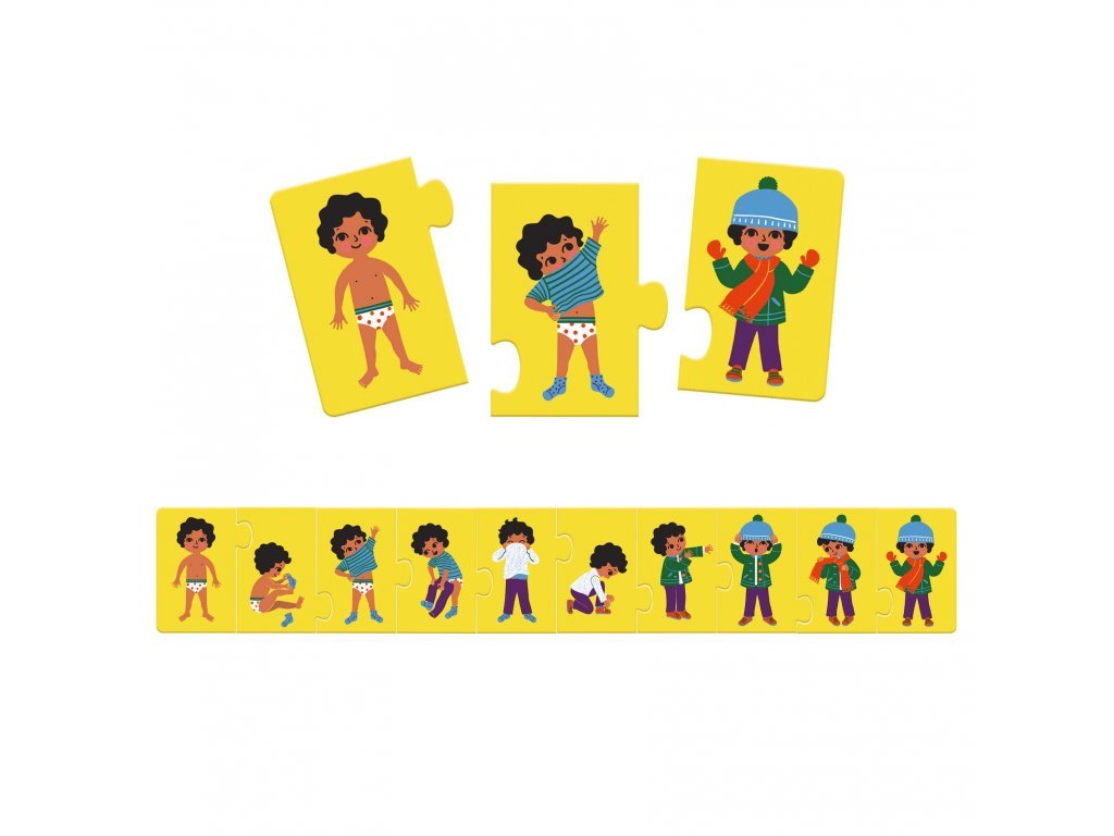 Puzzle pro děti od 3 let na téma oblékání. Děti se budou snažit seřadit 10 dílků puzzle za sebou v takovém pořadí, v jakém se oblékají jednotlivé kusy oblečení.