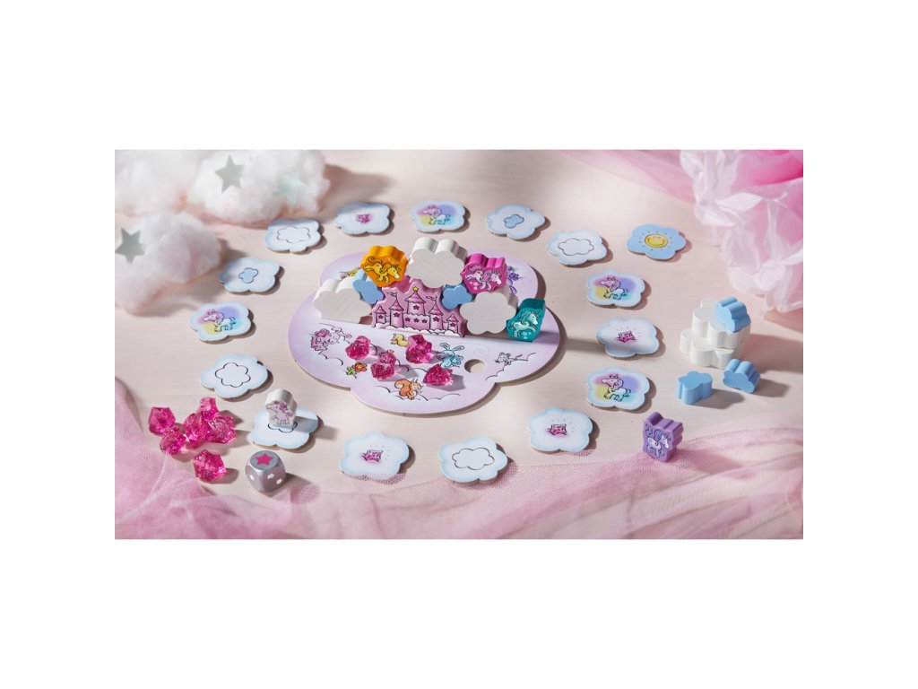 Hra obsahuje: 5 jednorožců, 1 zámek v oblacích, 5 velkých bílých mraků a 5 menších modrých mraků, 1 kostku, 1 herní plán, 16 oboustranných desek, 10 krystalů mraků a brožuru s návodem.
