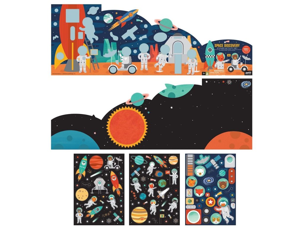 Sada obsahuje více jak 100 znovupoužitelných samolepek, které děti umisťují a přelepují dle libosti a vlastní fantazie na oboustranný podkladní obrázek. Z jedné strany podkladního obrázku je nekonečný vesmír, kam děti lepí rakety, družice, kosmonauty, planety,....a z druhé strany je vesmírná stanice, kde je potřeba dolepit chybějící části obrázku.