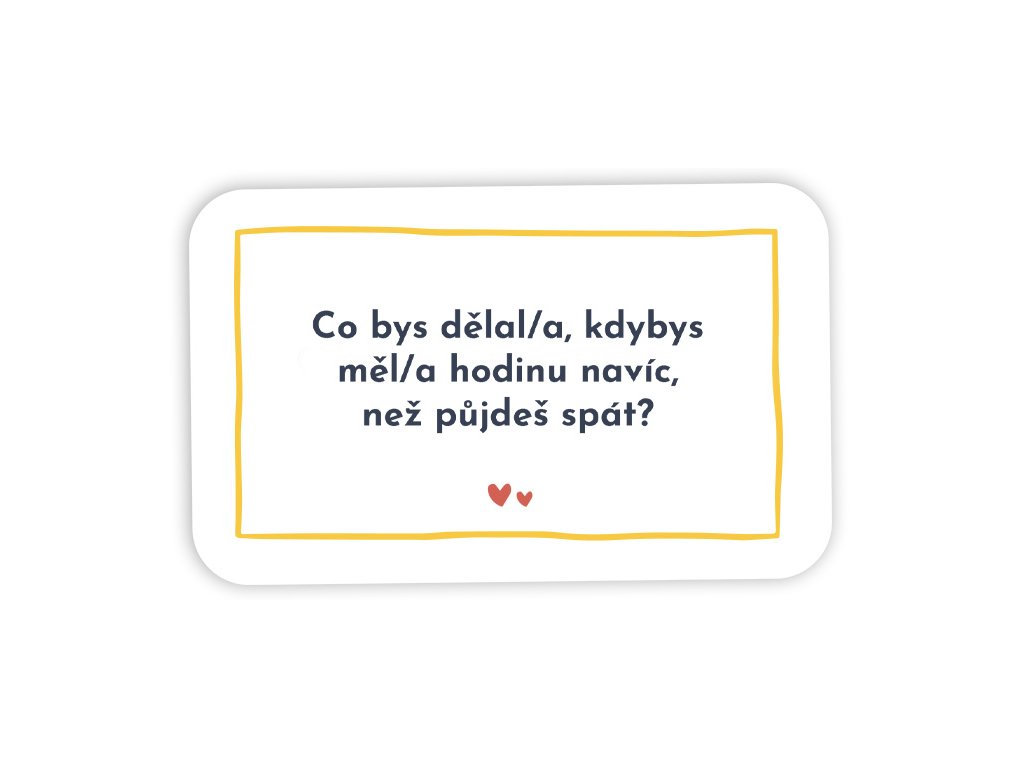 Každá z 54 karet obsahuje jemně formulovanou otázku, která podporuje reflexi dne, rozvoj emoční inteligence a vědomé budování vztahu rodič–dítě.